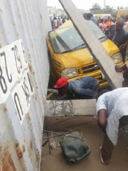 A truck carrying a container has lost control along Badagry Expressway and fallen on a bus carrying passengers at the ever busy Alakija bus stop, Lagos.