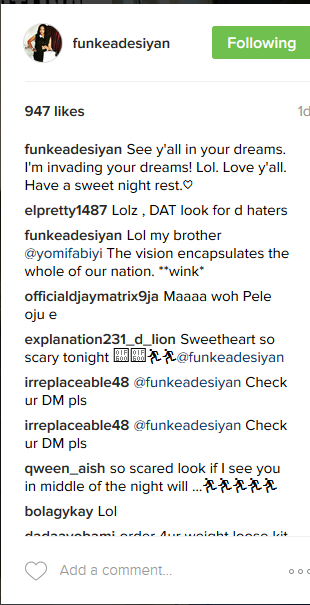Funke claimed she was striking a scary pose so as to appear in her followers dreams at midnight as she wrote: